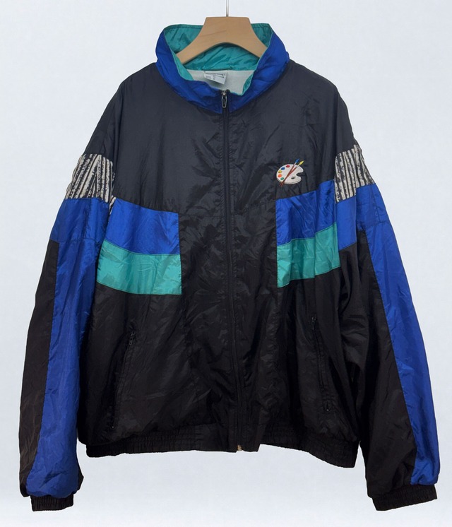 【一点物】O/W [OverWrite] ドローイング刺繍 ナイロンフルジップブルゾン (Black/Blue/Green) 古着にドローイング刺繍を施した一点ものプロジェクト「O/W [OverWrite]」シリーズからのスペシャルアイテムです。 ■ デザイン ベースとなるのは、ブラックを基調にブルーとターコイズグリーンの切り替えが入ったヴィンテージナイロンフルジップブルゾン。90年代を思わせるスポーティーな配色と、やや光沢のある軽量ナイロンの質感が特徴です。 背面には、魔法使いのドローイング刺繍を大胆に配置。 フロント左胸にはパレットと筆の刺繍をワンポイントで配置しています ■ 素材感・シルエット 薄手で軽量なナイロン素材を使用。シャカっとした質感で、春秋のライトアウターとして活躍します。 XLサイズ表記で、身幅64cmとゆとりのあるシルエットになっています 【サイズ表記・実寸】 メーカー表記: XLサイズ チェスト幅: 64 cm 肩幅: 63 cm 着丈: 70 cm 袖丈: 58 cm 裾幅: 56 cm (※古着アイテムをベースとしているため、採寸に±2cmほどの誤差が生じる場合がございます。あらかじめご了承ください。) 【コンディションについて】 本製品は古着をベースにリメイクを施した一点ものです。古着特有の着用感、細かなスレやほつれなどがある場合がございます。