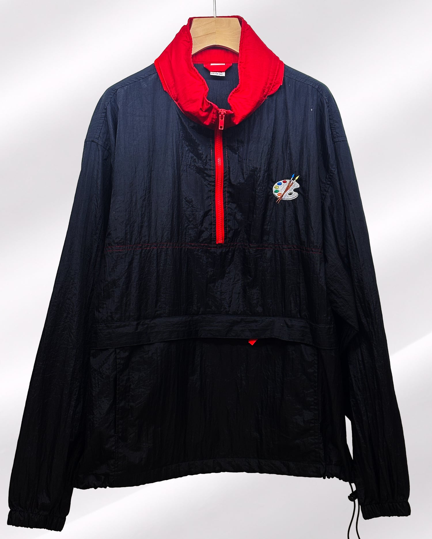 ベースとなるのは、シワ感のあるブラックボディに、レッドの襟とハーフジップが目を惹くナイロンアノラックジャケット。