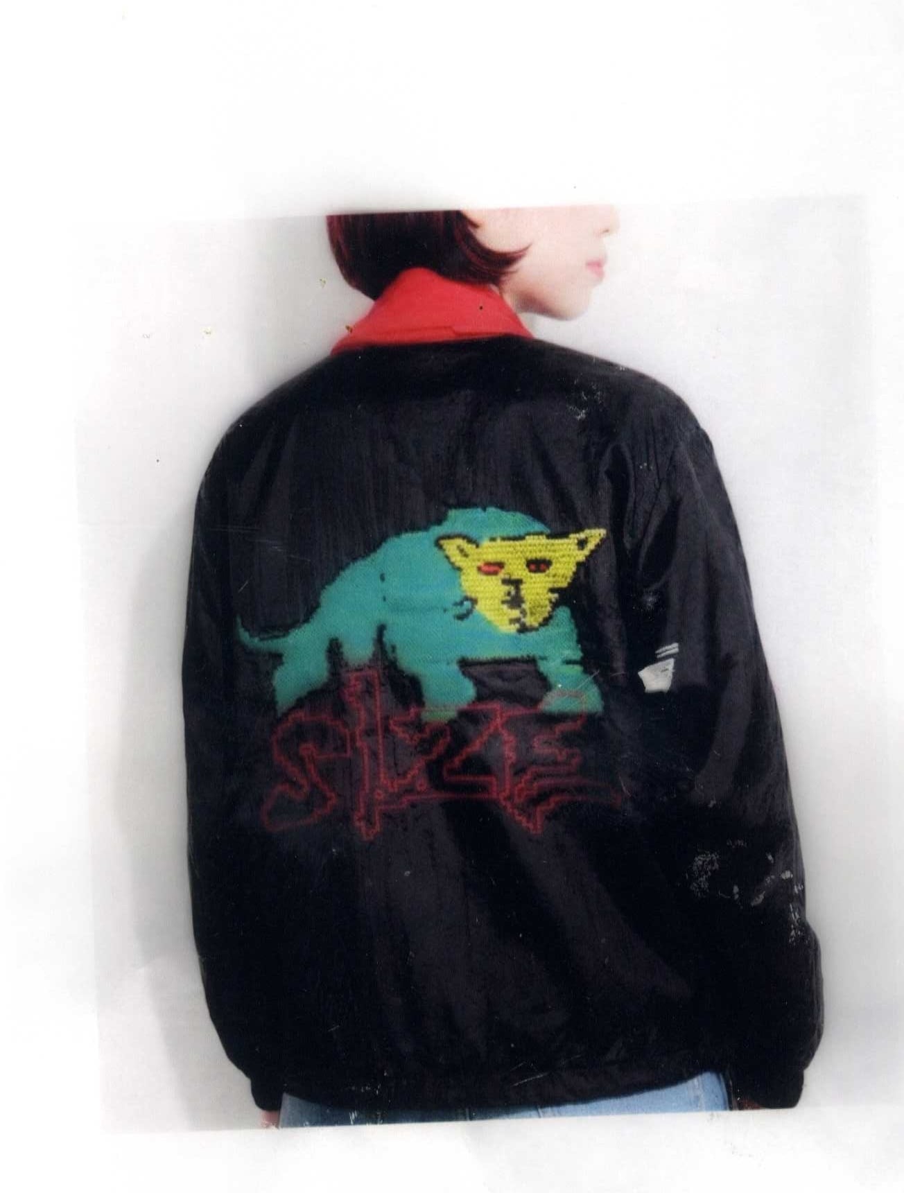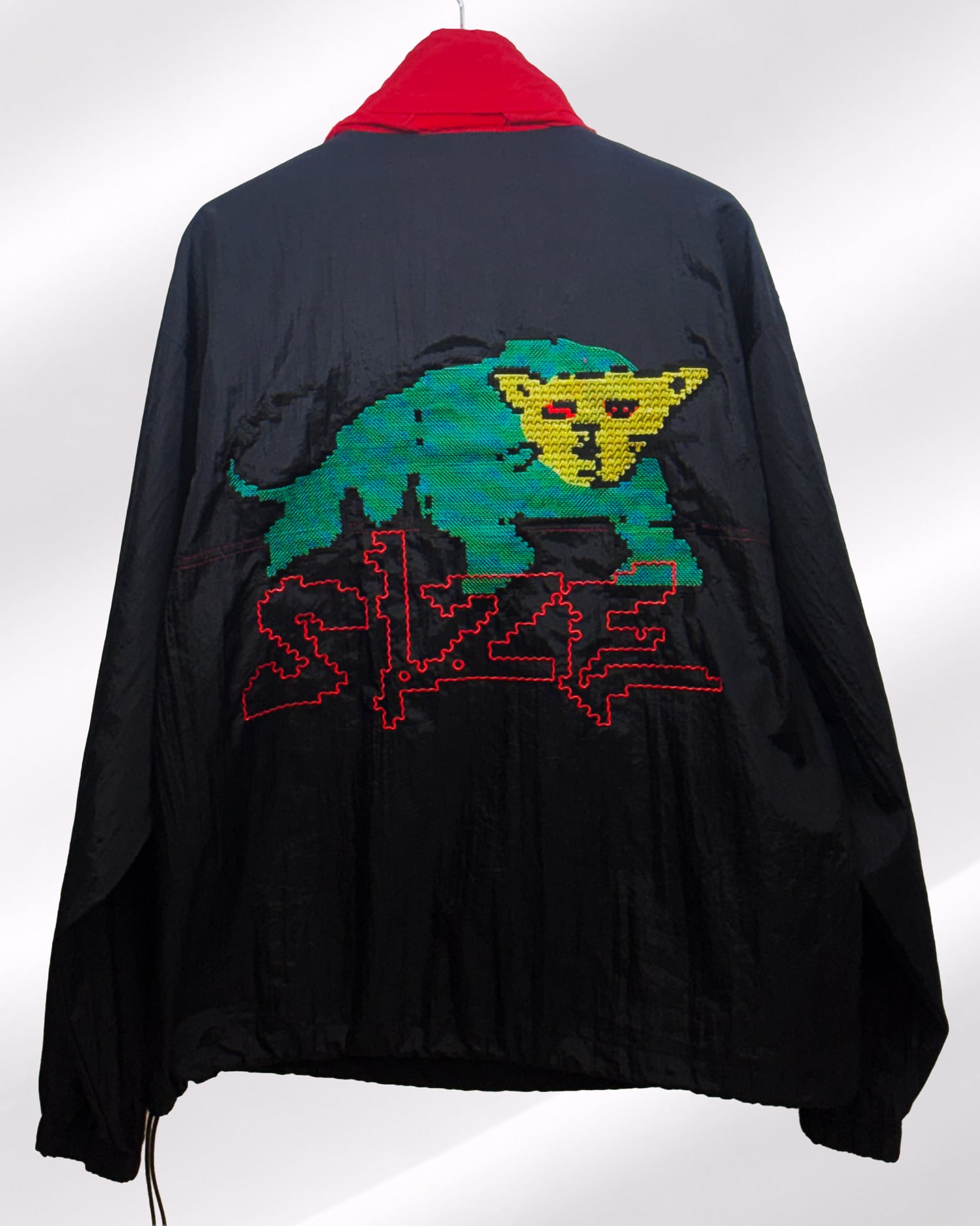 背面をキャンバスに見立てて施されたダイナミックなドローイング刺繍です。エッジの効いた赤いステッチワークと、ピクセルアートのように荒々しくも緻密に描かれたグリーンの獣が圧倒的な存在感を放ちます。