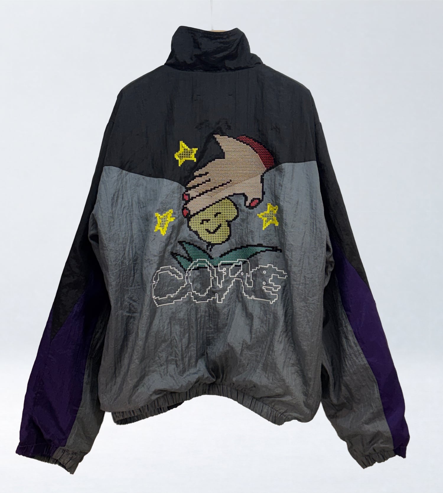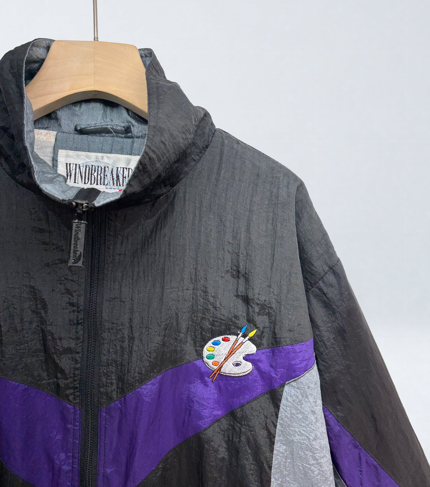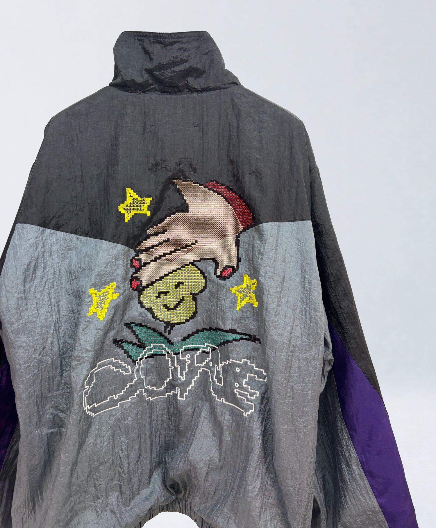 ベースとなるのは、ブラック・グレー・パープルの切り替えが特徴的なヴィンテージナイロンブルゾン。