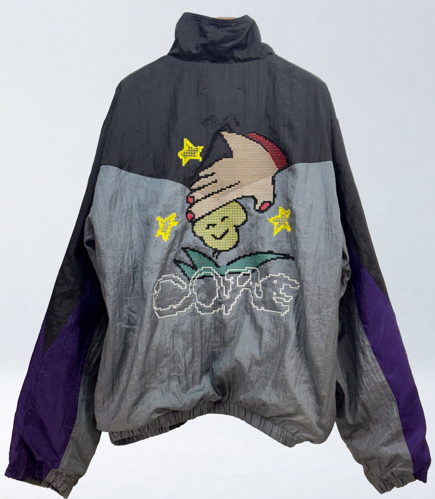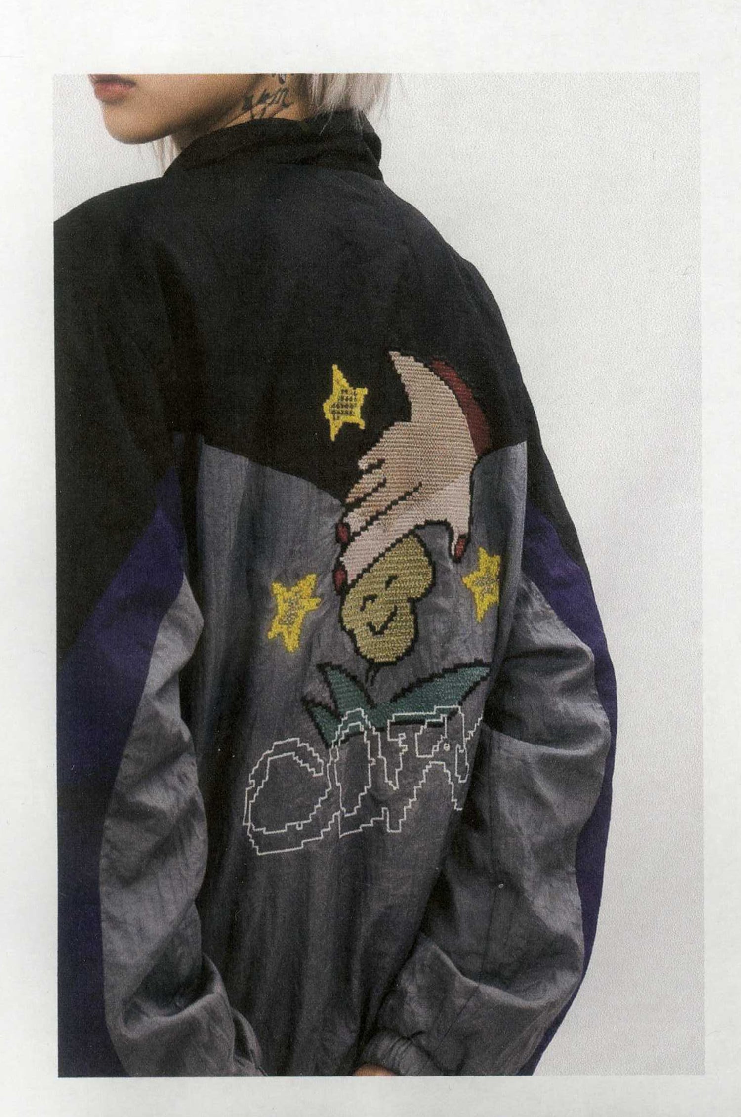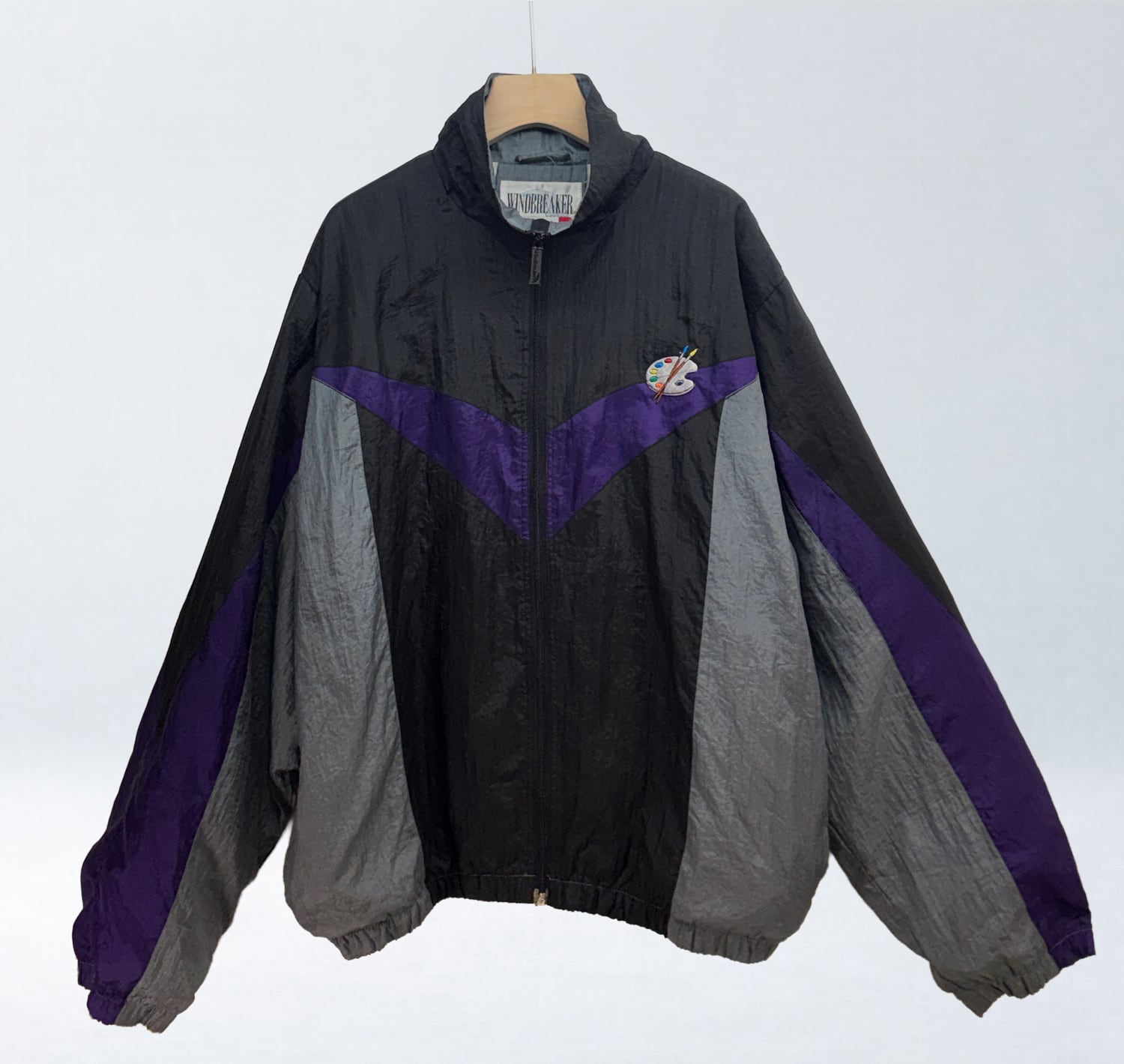 ベースとなるのは、ブラック・グレー・パープルの切り替えが特徴的なヴィンテージナイロンブルゾン。