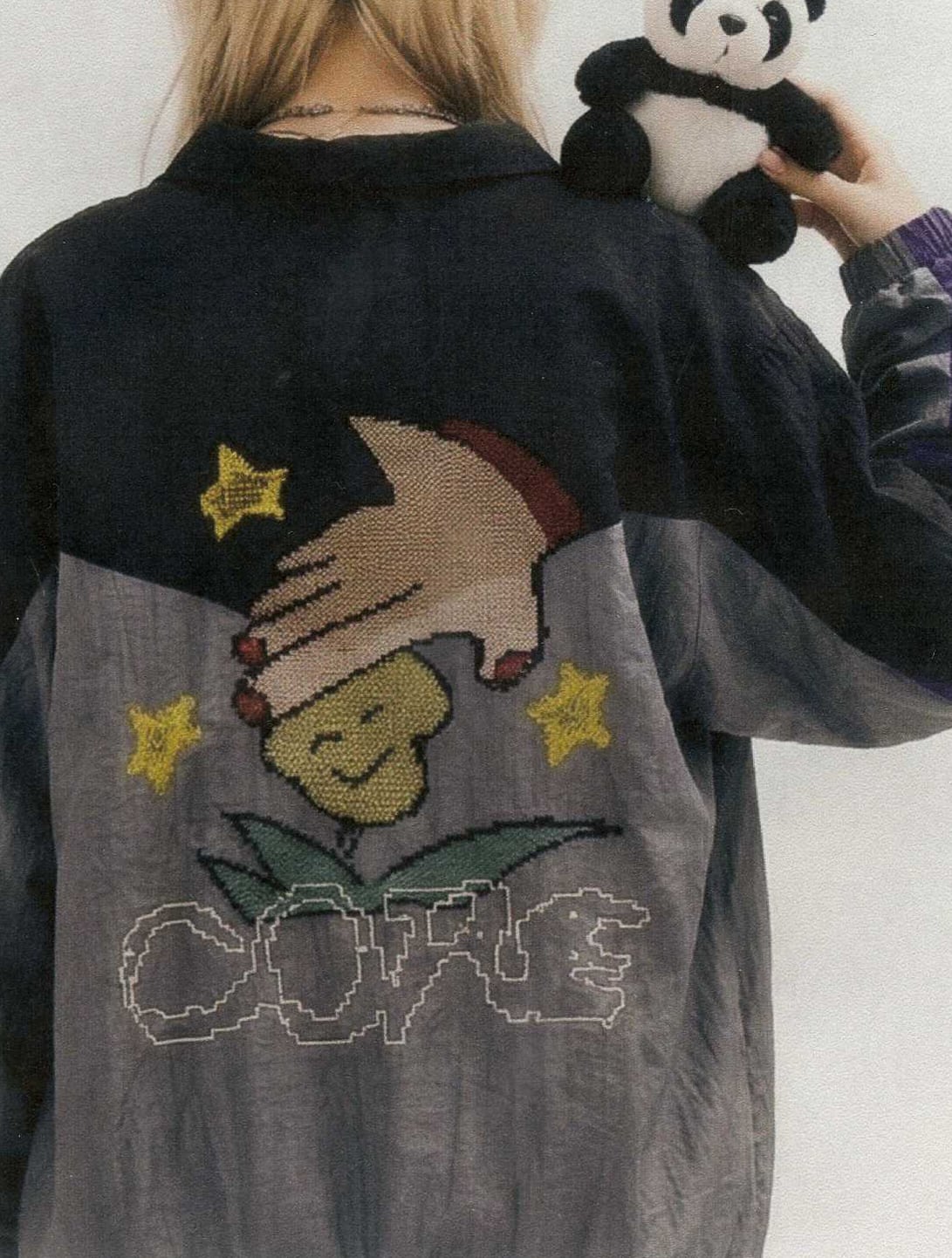 背面には、花を撫でる手をモチーフにしたドローイング刺繍を配置。